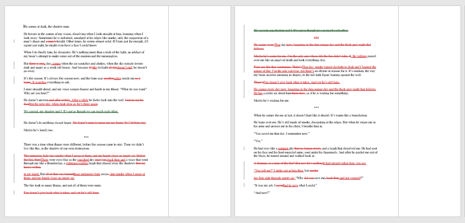 I always love seeing these, so here are snapshots comparing the draft I sent my CPs with the new version: